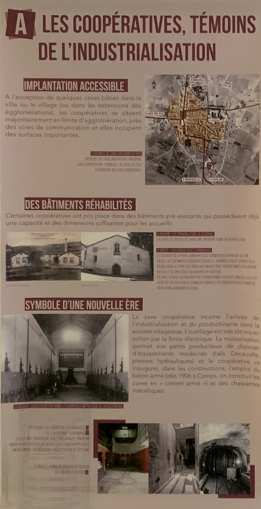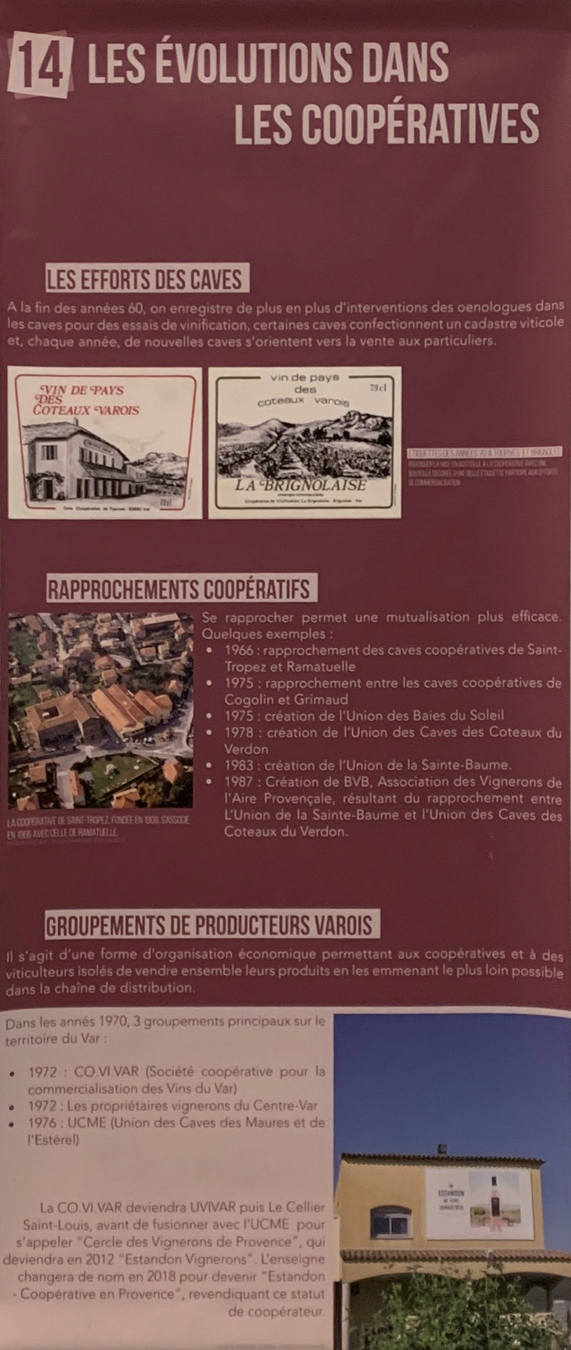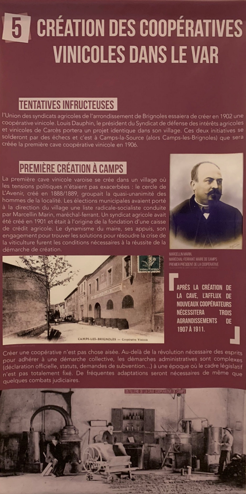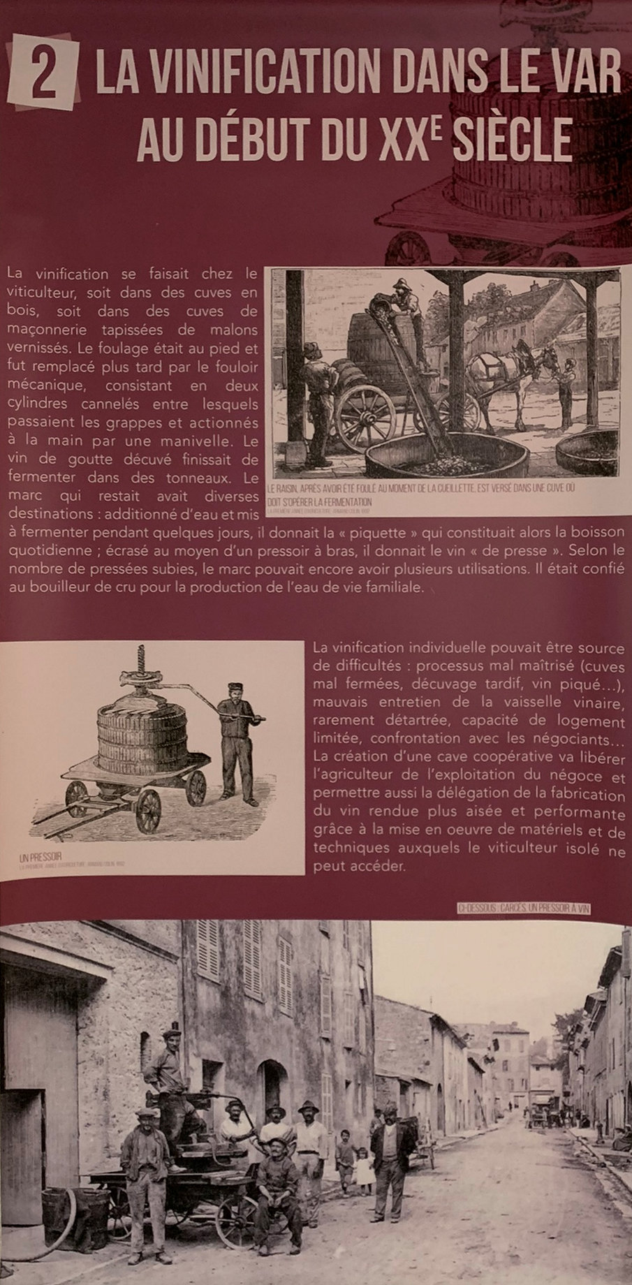 La Musée des Gueules Rouges de Tourves et l'Agglomération Provence Verte nous ont aimablement prêté les panneaux de l'exposition dont il sont à l"origine et qui retrace la création et l’évolution des caves coopératives vinicoles dans le Var depuis le début du vingtième siècle.