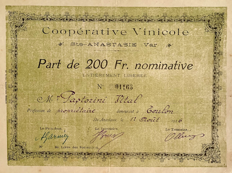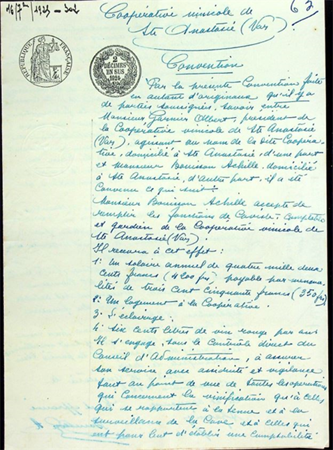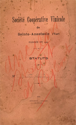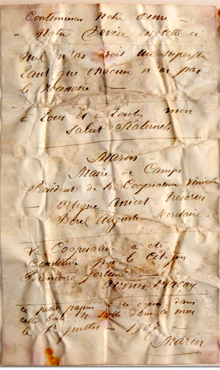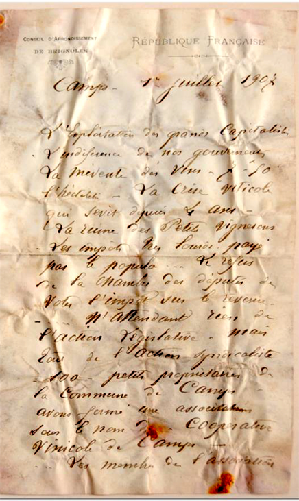 Dans cette enveloppe se trouvait une lettre également écrite par le maire. Il y indique de nombreux arguments qui ont incité 100 petits propriétaires de la commune, qui s'appelle alors Camps-les-Brignoles, à bâtir la première coopérative vinicole du Var et la seconde de France après celle de Maraussan (dans l’Hérault). Elle est inaugurée le 3 février 1907.