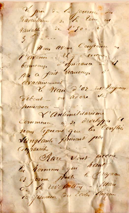 L’Antimilitarisme commence à se développer et nous espérons que les conflits sanglants finiront par disparaitre. Rares sont encore les hommes qui haut et ferme portent le Drapeau de la Révolution. Mais la jeunesse des écoles laïques continuera notre oeuvre.